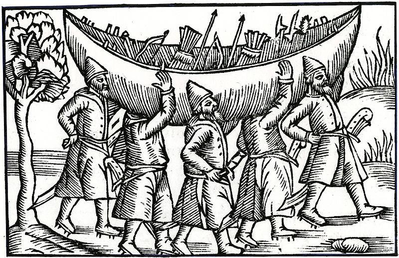 Ook de Zweden waren behendig met boten en ze maakten gebruik van de Russische rivieren. De rivier de Dnjepr kende echter zeven stroomversnellingen, die ze probeerden te mijden. Dit zouden ze gedaan hebben, door hun boten over land te vervoeren. Ze staken de roeiriemen door de roeigaten, zodat ze handvaten hebben, om de boot te dragen. De Slavische bevolking van Rusland, noemden de Zweden Russen (Roeiers) en het land is nooit meer die naam kwijtgeraakt. |